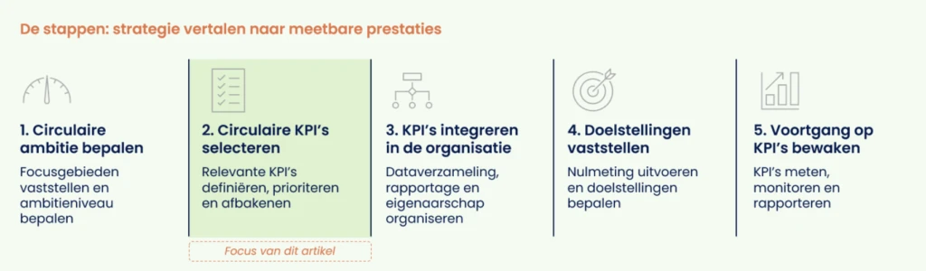 - Stel op basis daarvan een lijst op van mogelijke KPI’s, gebruikmakend van bestaande frameworks zoals het GCP, ESRS E5 of Circulytics.
